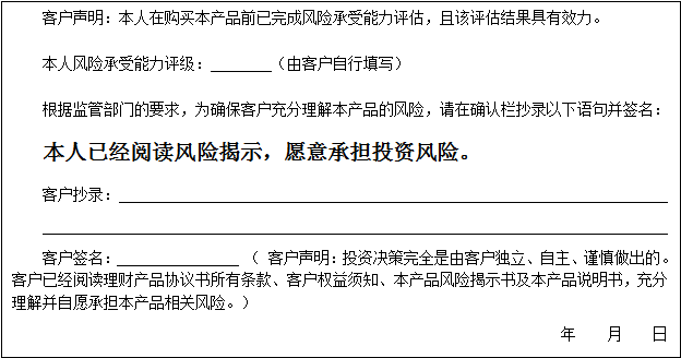 个人客户请在下面填写您的风险承受能力评级、抄录风险揭示语句并签字: