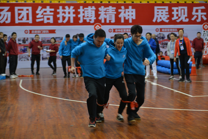 你看,大家已经迫不及待站在了起跑线上,脸上充满了期待和欢乐。裁判员一声令下,比赛开始了!只见有的组合奋力往前走,很快乱了步伐;有的组合由于配合不默契,摔倒、爬起、再摔到、再爬起继续走。大家喊着整齐的口号:“1、2、1、2、1、2……”虽然步子不大,但前行的速度很快。整个比赛紧张而又激烈,现场啦啦队分别为各自参赛队员大声呐喊加油,紧张欢愉的氛围久久萦绕在体育中心。