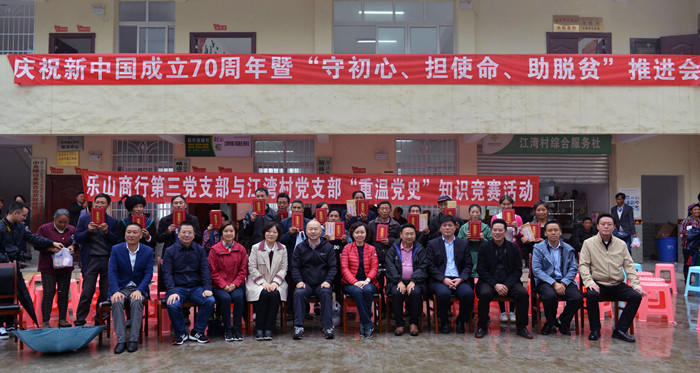 在经过一轮乐山商行第三党支部与江湾村党支部“重温党史”知识竞答预热后,活动正式拉开序幕。行领导们在致辞中,希望江湾村民继续保持良好的脱贫奔康势头,发扬不等不靠、自力更生的优良作风,在帮扶单位和扶贫干部的帮助和支持下,扩大产业规模、提高人均收入,要加强下一代教育、阻断贫困代际传递,为江湾村下一步实现乡村振兴打下坚实基础,并祝愿村民们身体越来越健康、生活越来越富足、日子越来越红火。
